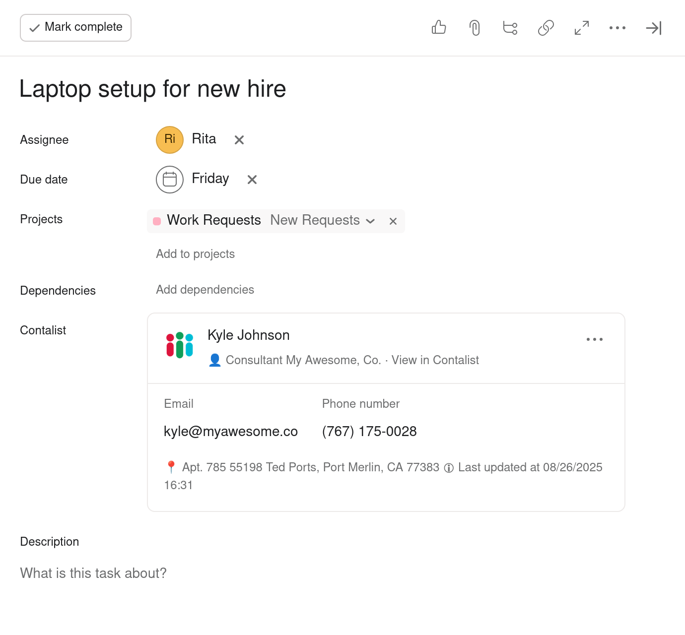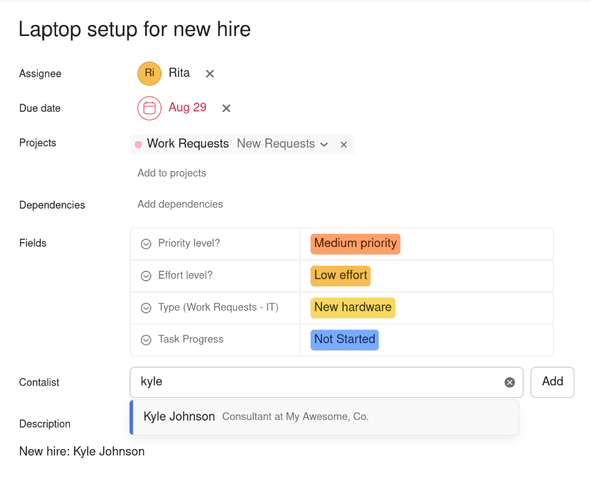Click the contact in the dropdown list to select it and it will be added to your task. Congrats! It's done.
