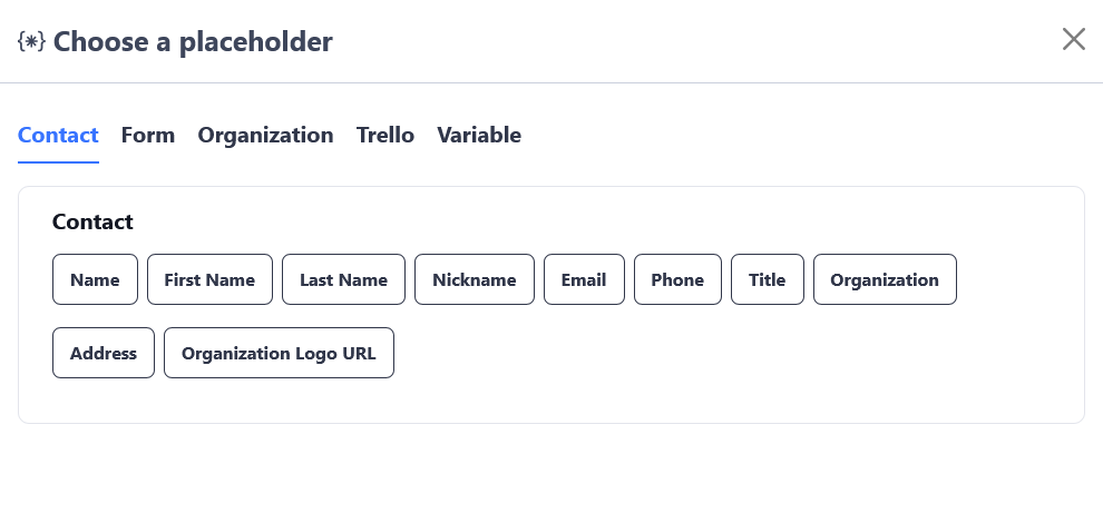 | Variables | {{ Variable > Tracking number }} | Variables are a special kind of placeholders. It's defined by you, and can fetch information from Trello's custom field on your card, or ask you to input the information. |