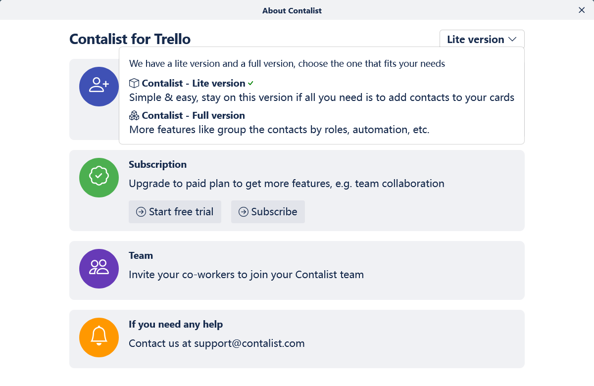 To switch to the Full version, click the Contalist board button (a button with an icon like this , and you can find it somewhere before the Power-Ups button), then choose About Contalist.