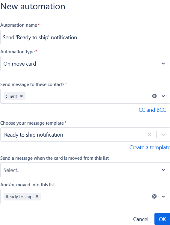 Now if you move the card for Chris's order into the list 'Ready to ship', an email notification will be sent to Chris.