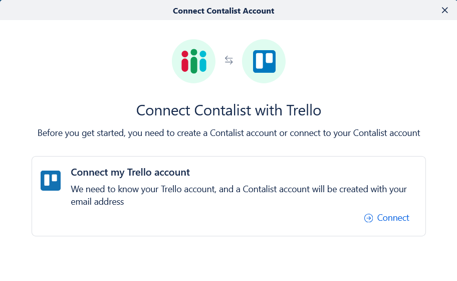 In the popup, click Connect my Trello account button, and you will be asked to authorize our app to access the information on your Trello account. A Contalist account will be created for you (with the same email address of your Trello account) if you haven't created an account before, and it will be connected with your Trello account.