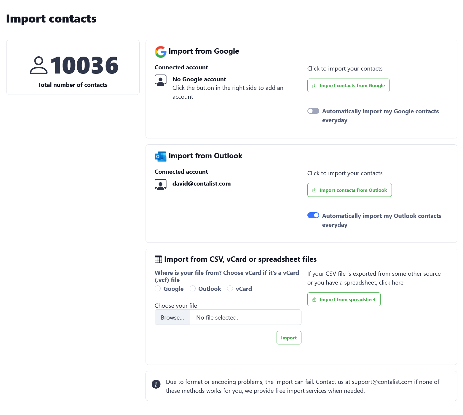 Well, please can contact us at support@contalist.com. We can help import them if needed.